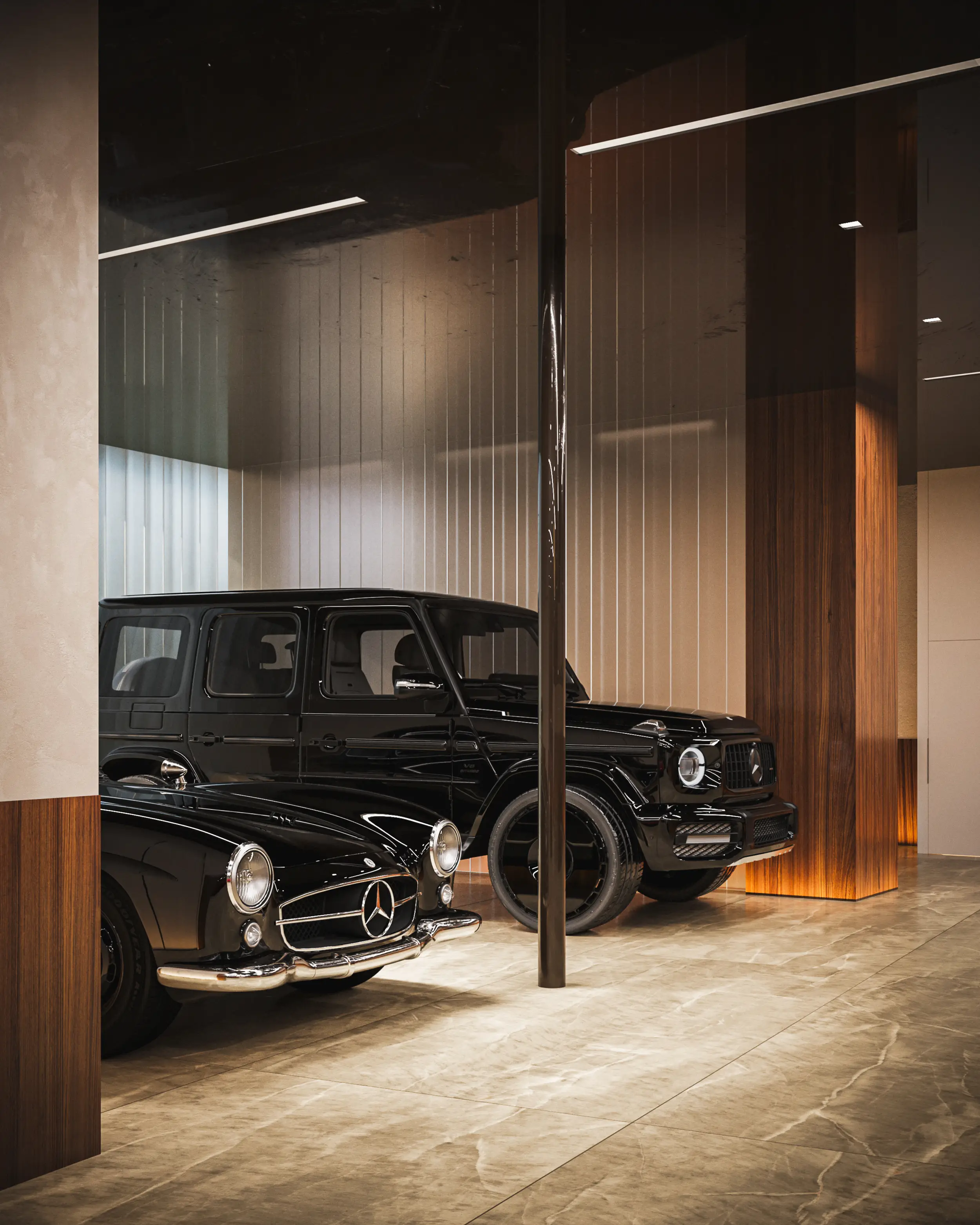 The automotive gallery at The Thermal Club combines sculptural architecture with bespoke storage, celebrating high-performance cars in a space that blends luxury and precision.